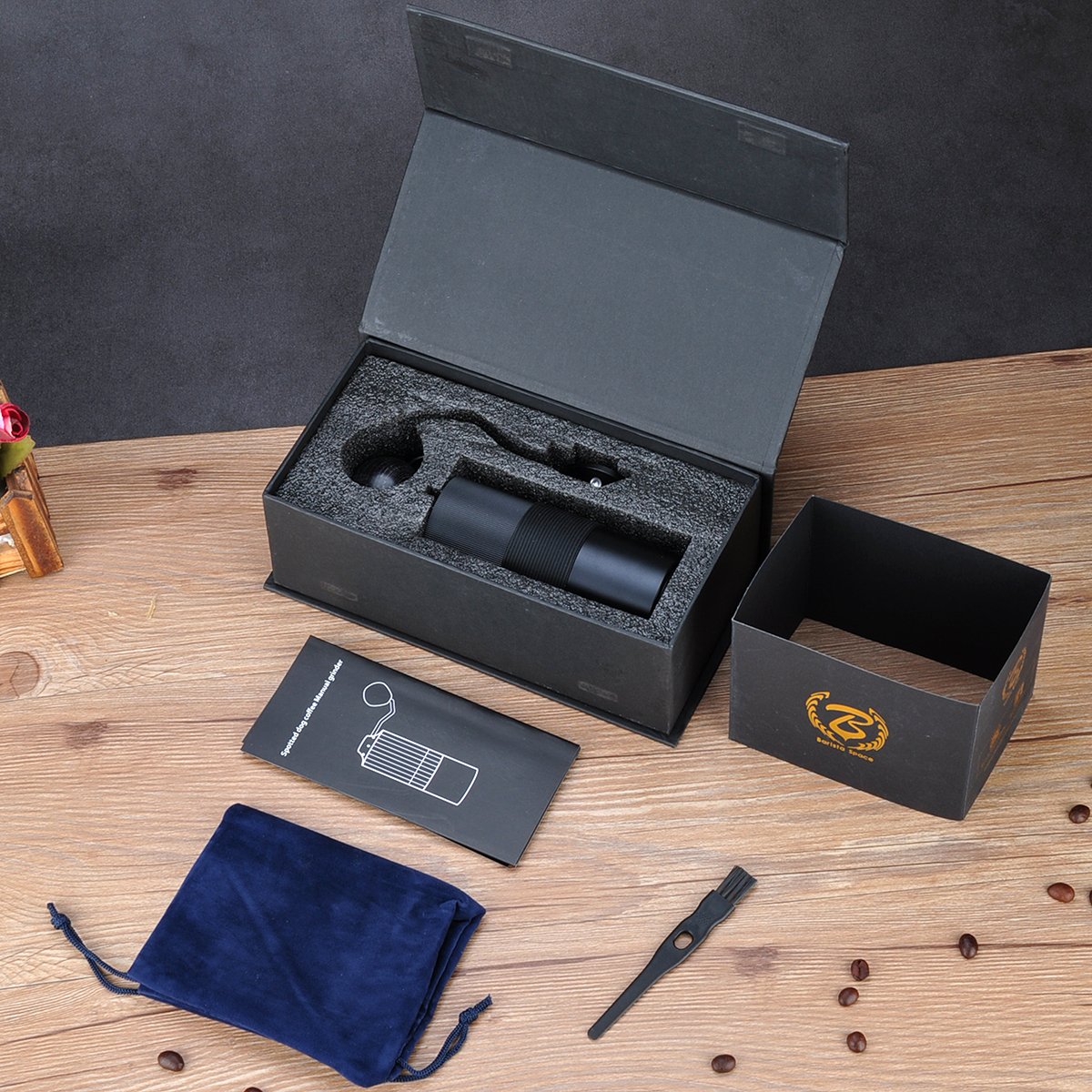 Korpus i pojemnik na zmieloną kawę zostały wykonane z aluminium, przez co całość jest stabilna i trwała. W górnym pojemniku mieści się 18 gramów ziarna, co wystarcza np. na dużą porcję kawy z dripa. Dolny pojemnik wkręca się na gwint, dzięki czemu trzyma on się pewnie na miejscu. Korpus jest opleciony gumową opaską dla pewniejszego chwytu, a rączka jest zakończona drewnem.