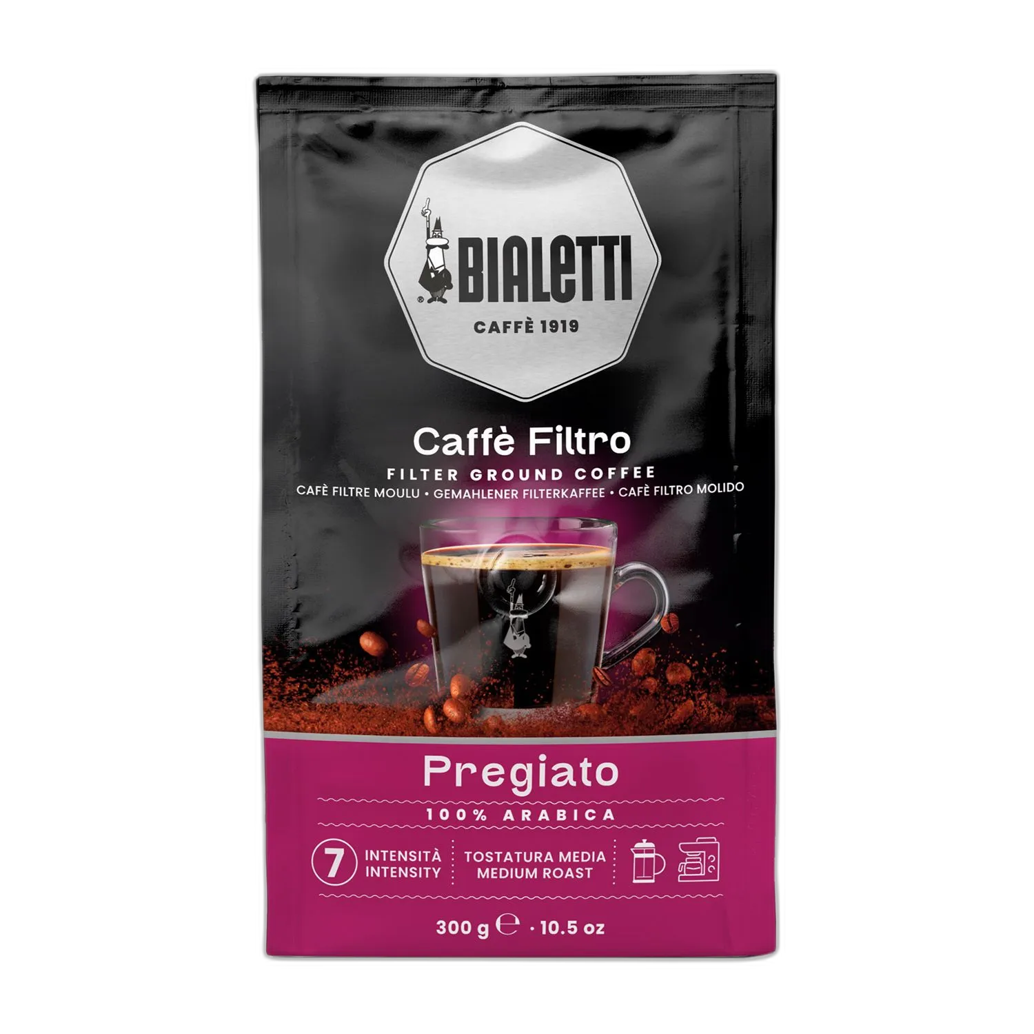 Bialetti Caffe Filtro Pregiato to kawa mielona o średnim profilu palenia. To 100% Arabika o delikatnym smaku, o wyczuwalnych nutach kwiatów oraz suszonych owoców. Ze względu na grubość mielenia i profil palenia, kawa sprawdzi się we french pressach.
