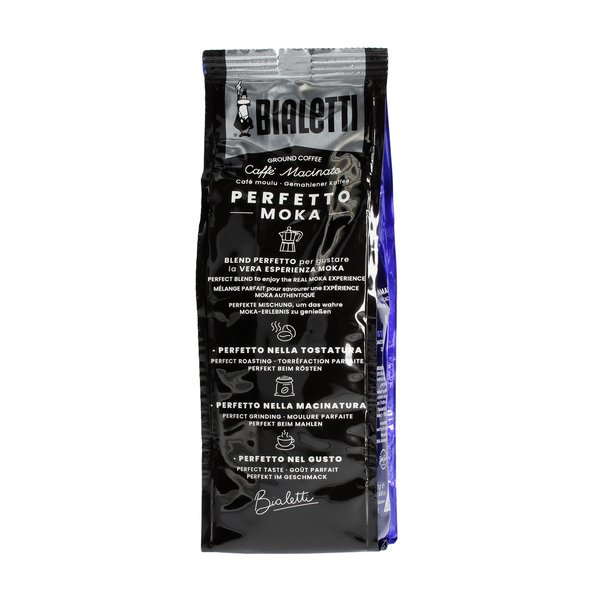 Bialetti Perfetto Moka Intenso to kawa mielona o ciemnym profilu palenia. Mieszanka robusty z Indii (70%) i arabiki (30%) o intensywnym smaku, o wyczuwalnych nutach kakao i pieczonego chleba.