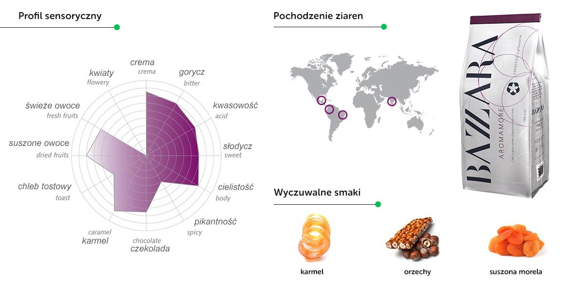 Bazzara Aromamore to mieszanka amerykańskich arabik (70%) z indyjską robustą (30%), która zapewnia kawie charakterystyczny, intensywny smak. Aromamore najlepiej sprawdzi się w formie włoskiego espresso, które na długo zapada w pamięci. Kawa sprawdzi się również w przygotowaniu innych specjałów kawowych.