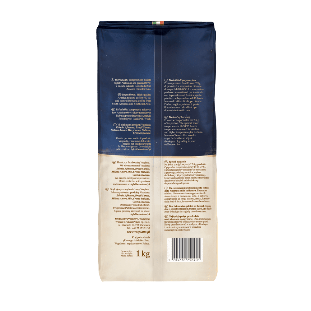 Składniki: wysokogatunkowa kompozycja kaw Arabica (60%) i kaw naturalnych pochodzących z Ameryki Południowej i Azji Południowo-Wschodniej.
