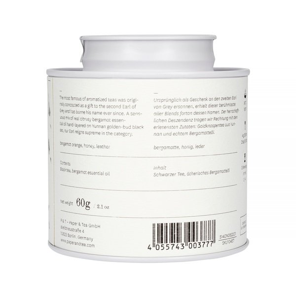 Klasyczny Earl Grey z kultowego berlińskiego Paper & Tea. To wysokiej jakości czarna herbata z chińskiej prowincji Yunnan wraz z olejkiem z bergamotki. Ten brytyjski klasyk w niemieckim wykonaniu posmakuje każdemu miłośnikowi tradycyjnych smaków – w kubku pojawia się moc czarnej herbaty, pomarańczowa bergamotka, akcent miodu i delikatny aromat skóry.