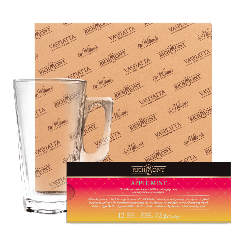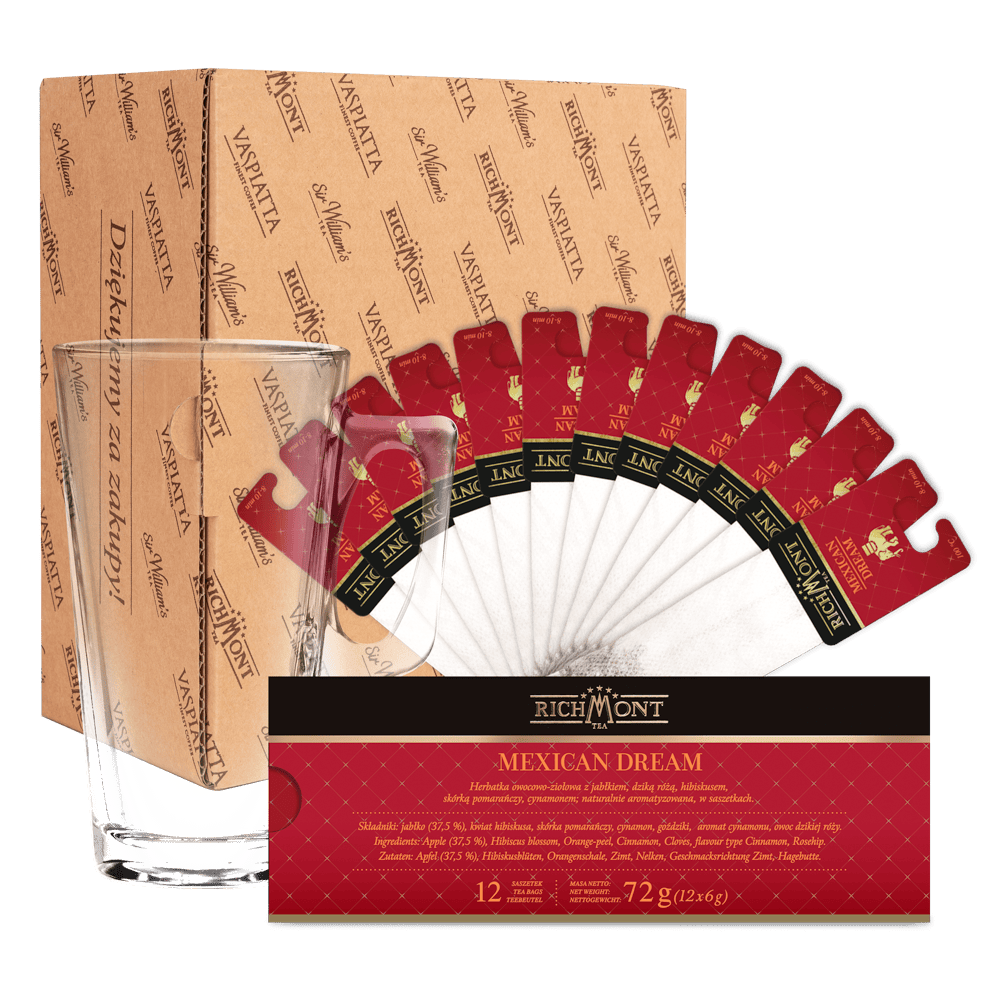Zestaw został wzbogacony o elegancką szklankę Richmont Hot o pojemności 370 ml, która doskonale wydobywa głębię smaku i aromatu herbaty, dodając każdej chwili wyjątkowej elegancji. To nie tylko zestaw herbat – to prawdziwa podróż po tradycji i smaku, idealna zarówno na kameralne spotkania, jak i wyjątkowe okazje.