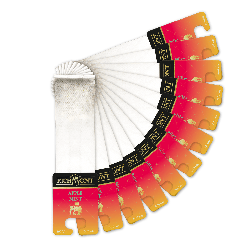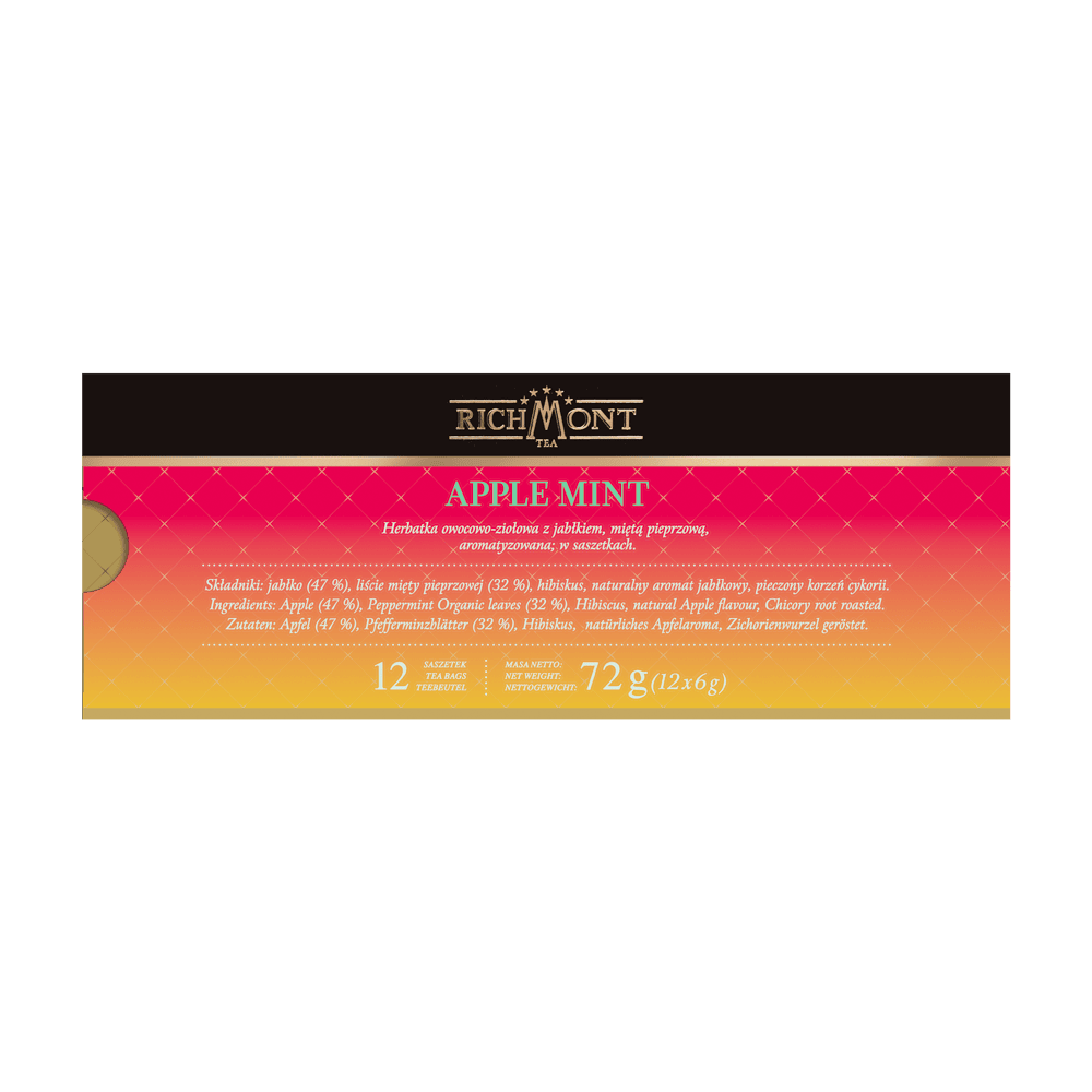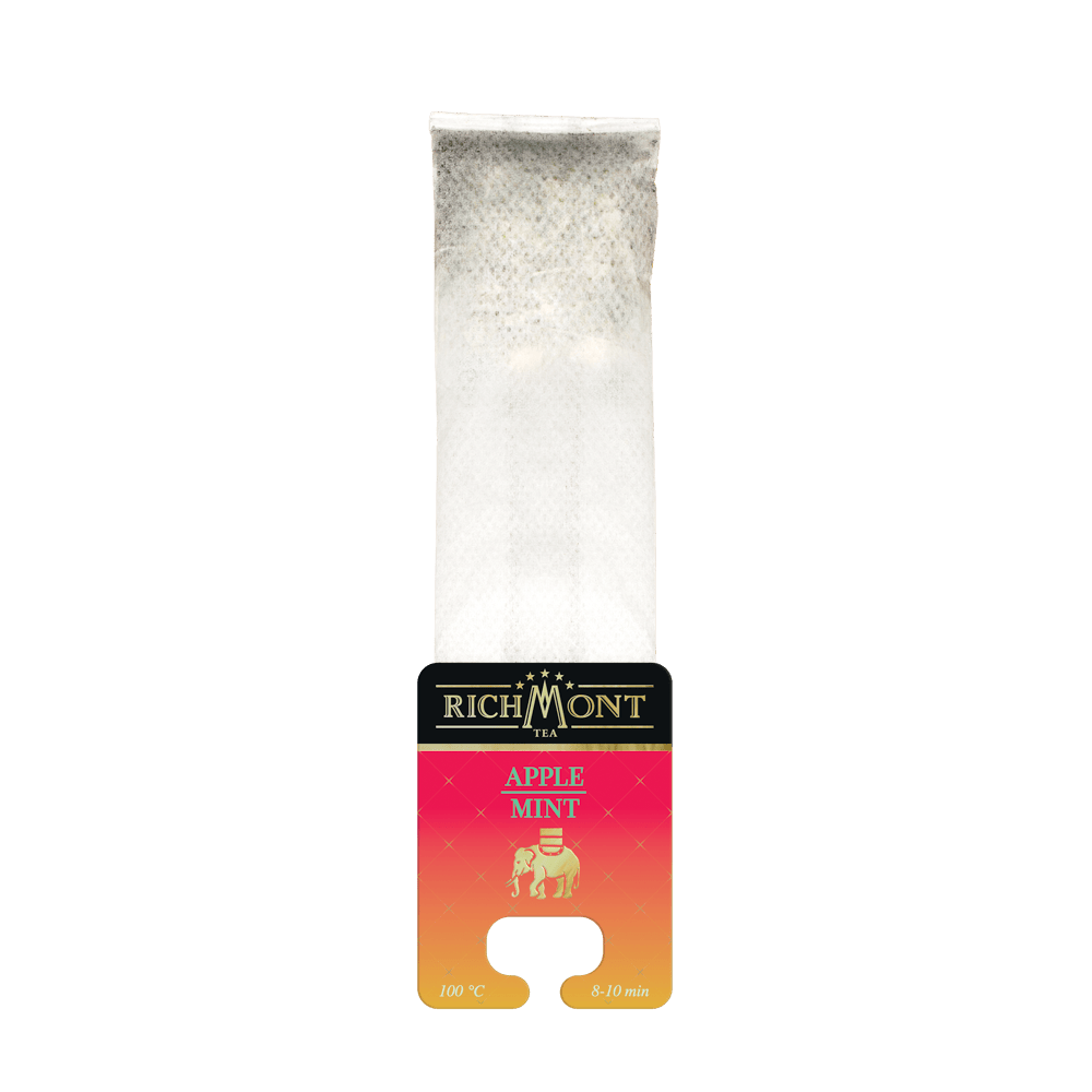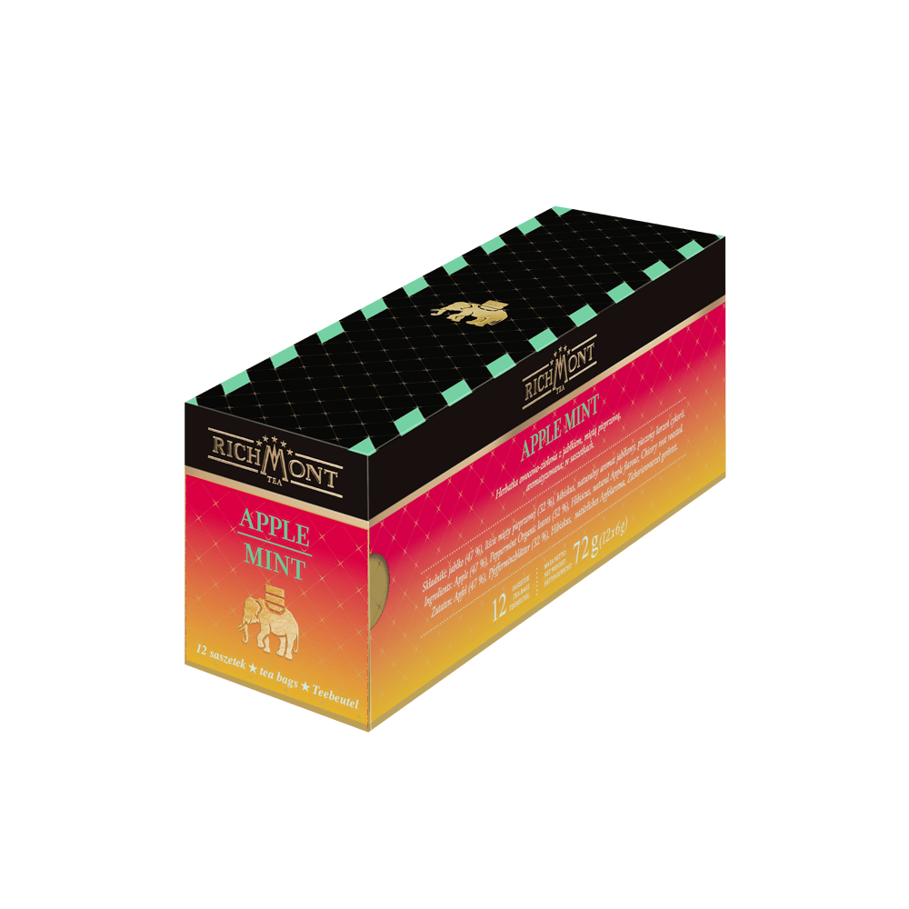 Herbatka owocowo-ziołowa z jabłkiem, miętą pieprzową, aromatyzowana w saszetkach. Wspomnienie letniego sadu. Soczyste jabłko i mięta. Dobroczynnie wpływa na zdrowie. Smakuje przyjemnością. Napar, który z odrobiną miodu może stać się orzeźwiającym deserem.