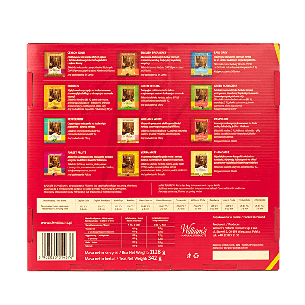 Drewniany prezenter zawiera 180 saszetek herbat w 12 smakach (12×15 saszetek): Ceylon Gold, English Breakfast, Earl Grey, Green Sencha, Green Maracuya, Peppermint, Williams White, Yerba Mate, Raspberry, Forest Fruits, Rooibos, Chamomile.