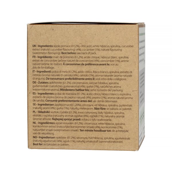 Składniki: wytłoki z jabłek, kwas cytrynowy, biały hibiskus, spirulina, ekstrakt z ogórka (naturalny aromat ogórka), ogórek, naturalny aromat (aromat arbuza).