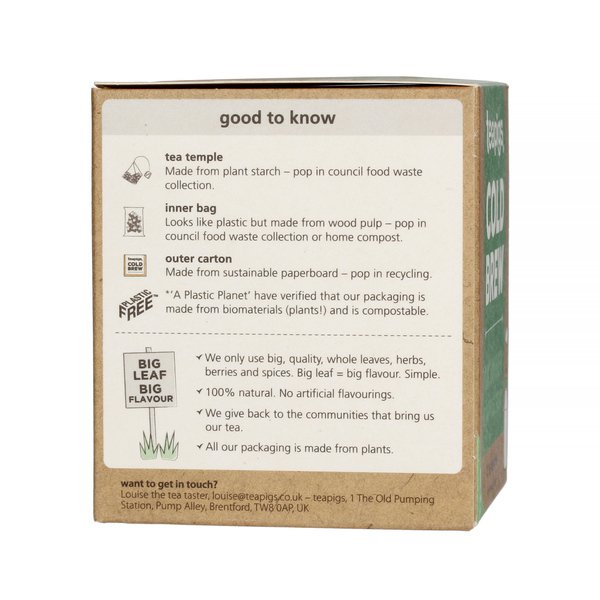 Teapigs to marka, która dba o naszą planetę! Ich opakowania są nie tylko wyjątkowo ładne, ale również przyjazne środowisku, a piramidki, w których znajduje się herbata, są całkowicie biodegradowalne – powstały z papieru i skrobi ziemniaczanej. A to jeszcze nie wszystko! Folia, w którą zapakowane są piramidki Teapigs (uwaga!) wcale nie jest z plastiku – jest za to całkowicie biodegradowalna i kompostowalna, ponieważ powstała z folii celulozowej.